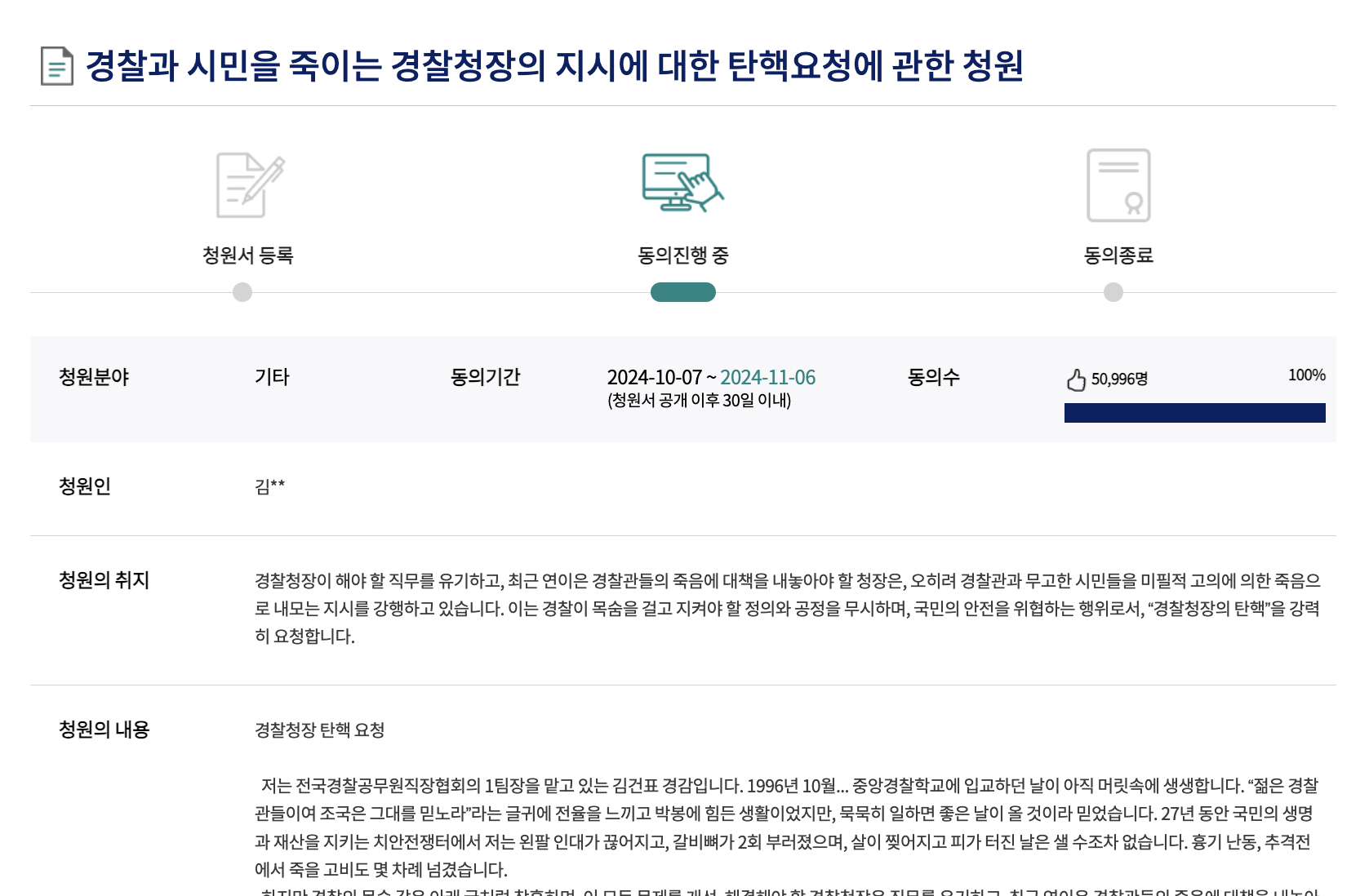 경찰청장의 탄핵 여부와 상관없이, 이번 청원을 통해 경찰 조직이 국민의 기대에 부응하는 방향으로 변화할 수 있기를 기대합니다.