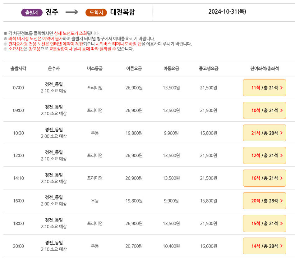 위 사진의 시간표는 진주시외버스터미널에서 대전 가는 버스 시간표입니다. 만약 목적지가 다르다면, 위에 안내드린 링크로 시간표 확인하시기 바랍니다.