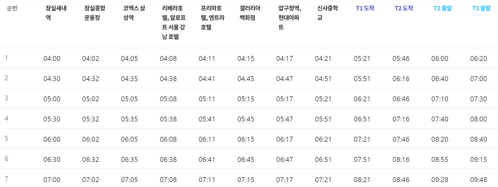 그러면 아래와 같이 정류장별로 6006 공항버스 시간표 확인할 수 있습니다.